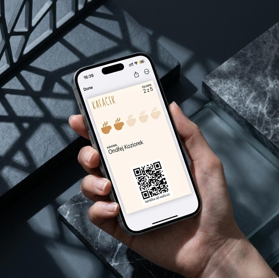 Ne. Karta funguje přímo v Apple Wallet nebo Google Wallet – aplikacích, které zákazníci už mají v telefonu. Stačí naskenovat QR kód a karta je okamžitě přidána. Žádná registrace ze strany zákazníka.